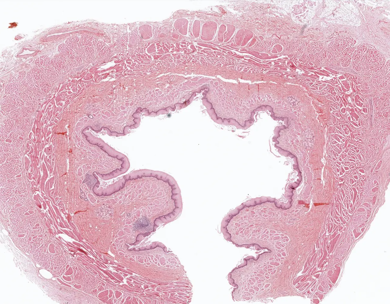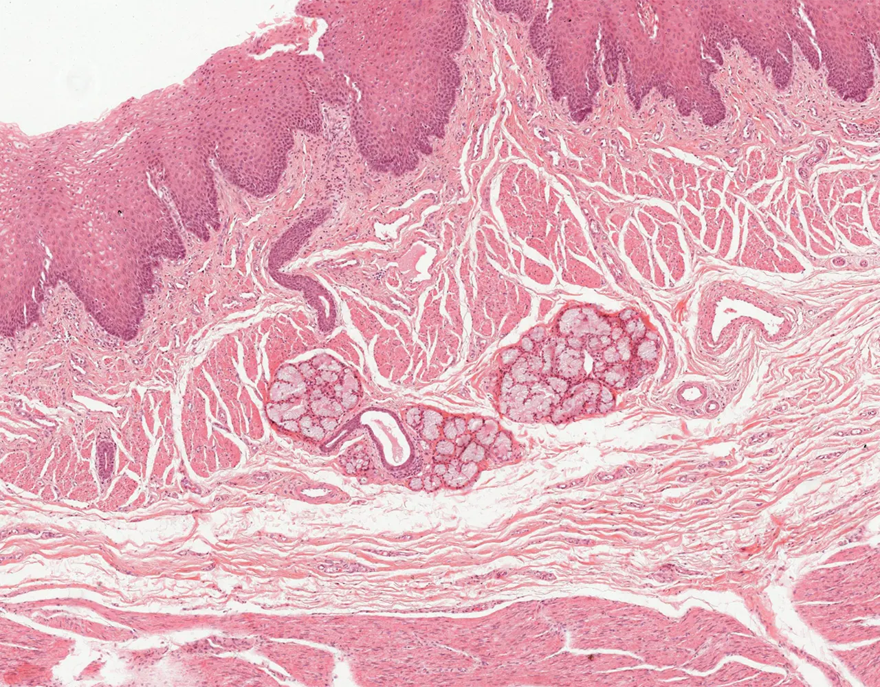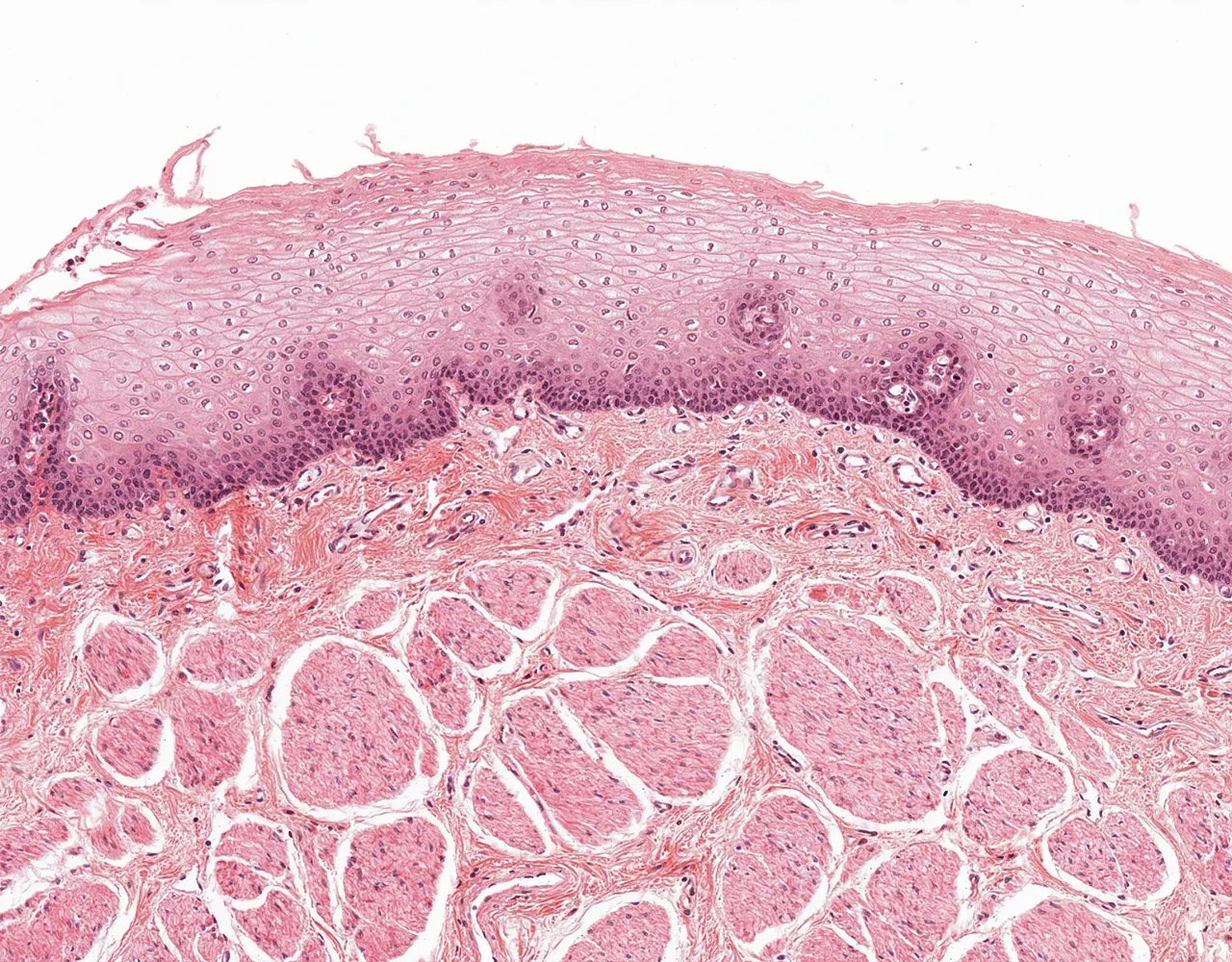 - Microscopically, the esophagus is composed of four layers: mucosa, submucosa, muscularis propria, and adventitia.