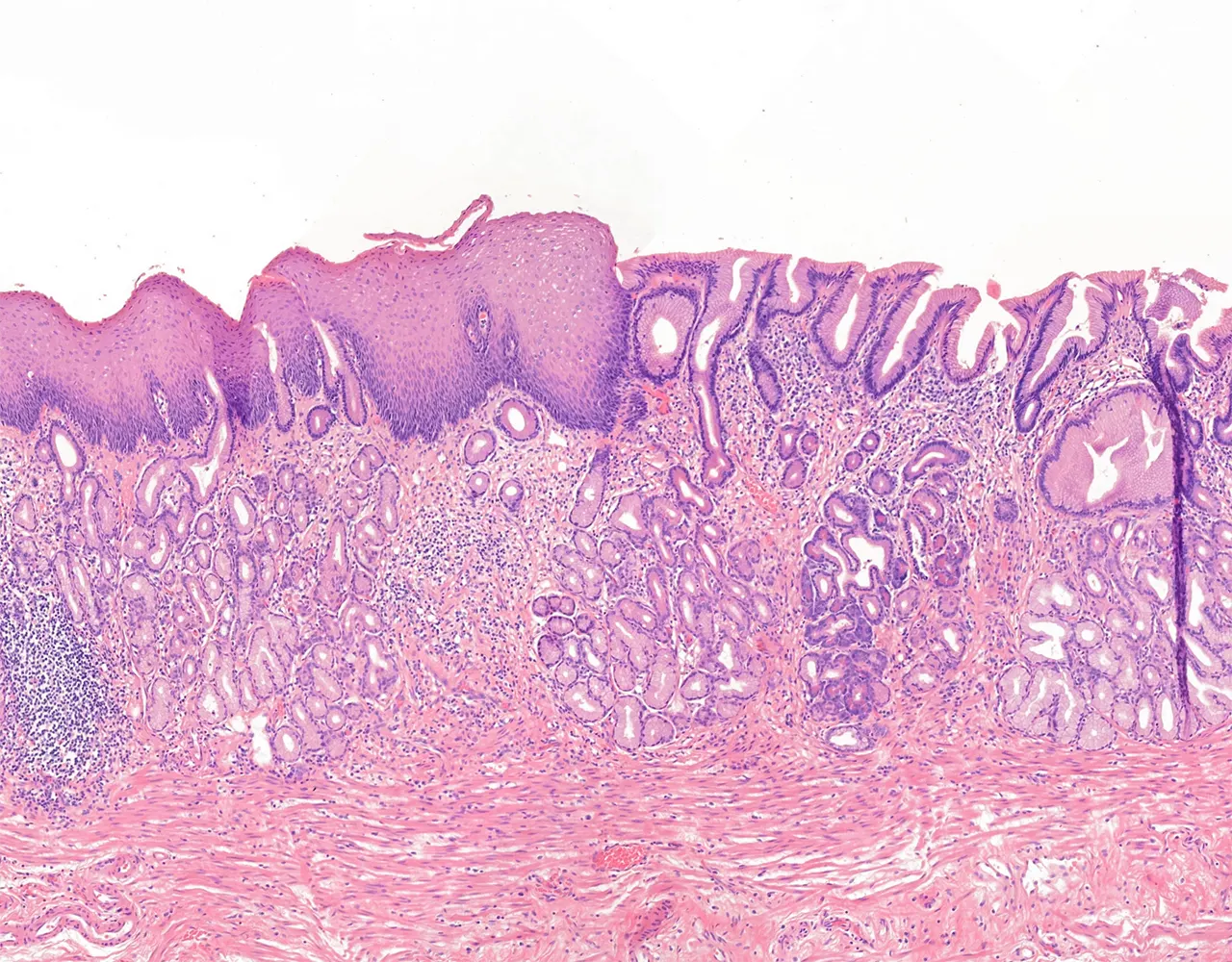 - Begins at level of cricoid cartilage, extends down within posterior mediastinum and through diaphragm, and connects to stomach at the gastroesophageal junction (GEJ).
