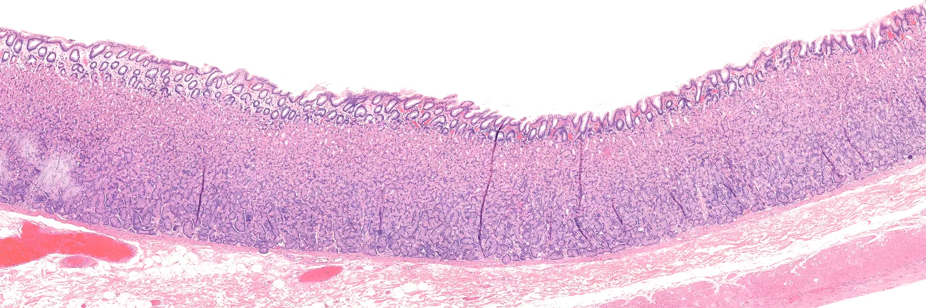 - Characterized by rugae : prominent folds of the mucosa and submucosa, mainly visible in the empty stomach.